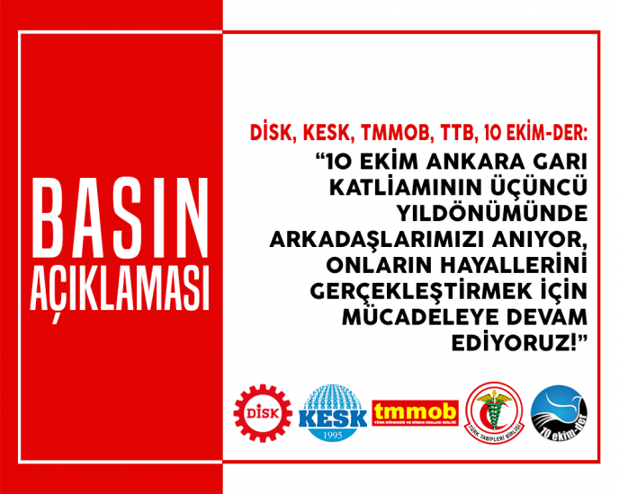 10 Ekim Katliamı’nın Üçüncü yıldönümünde DİSK, KESK, TMMOB, TTB ve 10 Ekim-Der Ankara Garı önünde ve yurt genelinde düzenlenecek anma etkinliklerine katılım çağrısında bulundu. Çağrı metni aşağıdadır.
