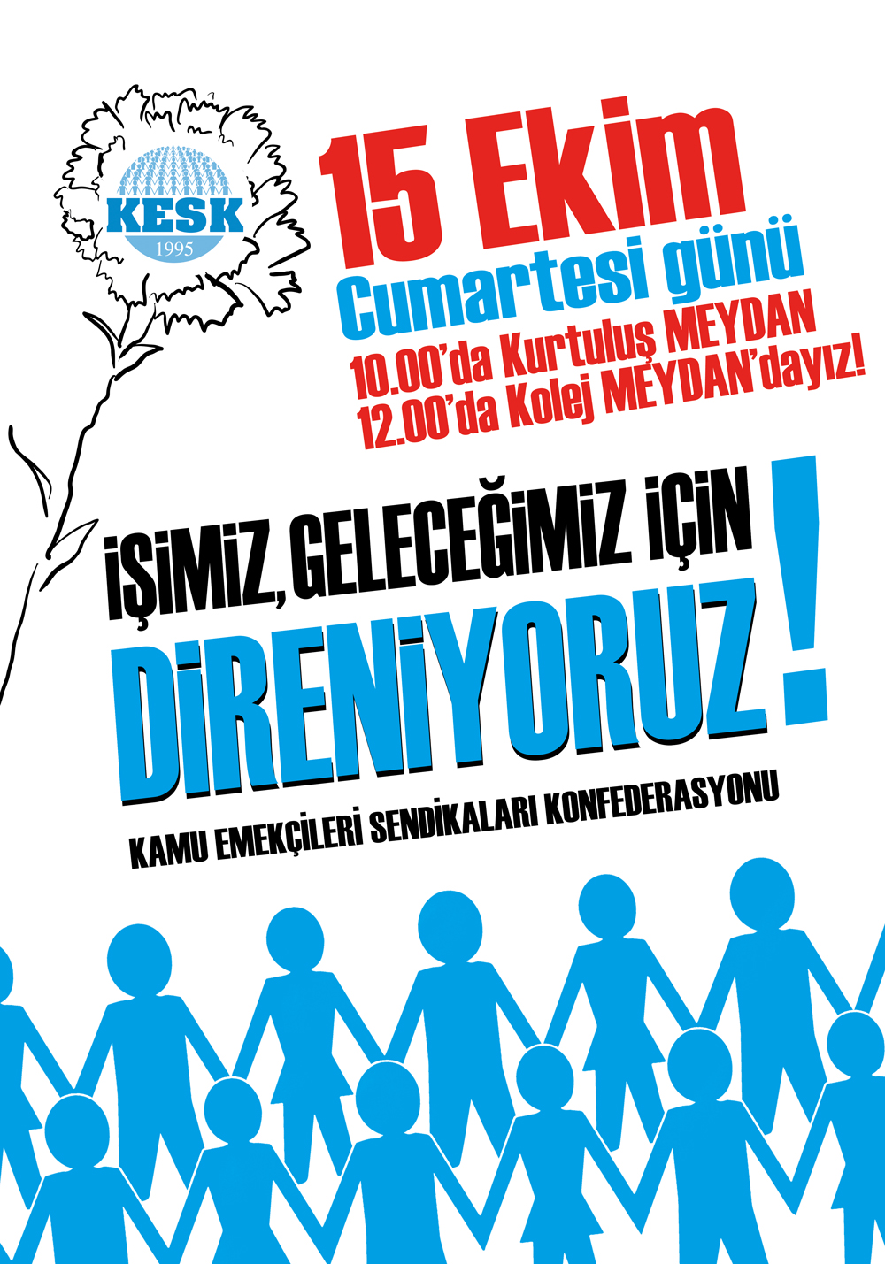 Türkiye’nin dört bir yanından KESK üyelerinin kitlesel biçimde katılacağı miting Saat: 12:00’de Kolej Meydanı’nda yapılacak. Miting çalışmaları kapsamında İstanbul, İzmir ve Diyarbakır kollarından hareket edecek yürüyüş kolları 15 Ekim’e kadar bulundukları illerde basın açıklaması ve farklı etkinliklere katılarak taleplerimizi dile getirecek. Yürüyüş Kolları tüm illerden gelecek KESK üyeleri ile 15 Ekim Saat 10:00’da Kurtuluş Meydanında buluşarak Kolej Meydanı’na hareket edecek.