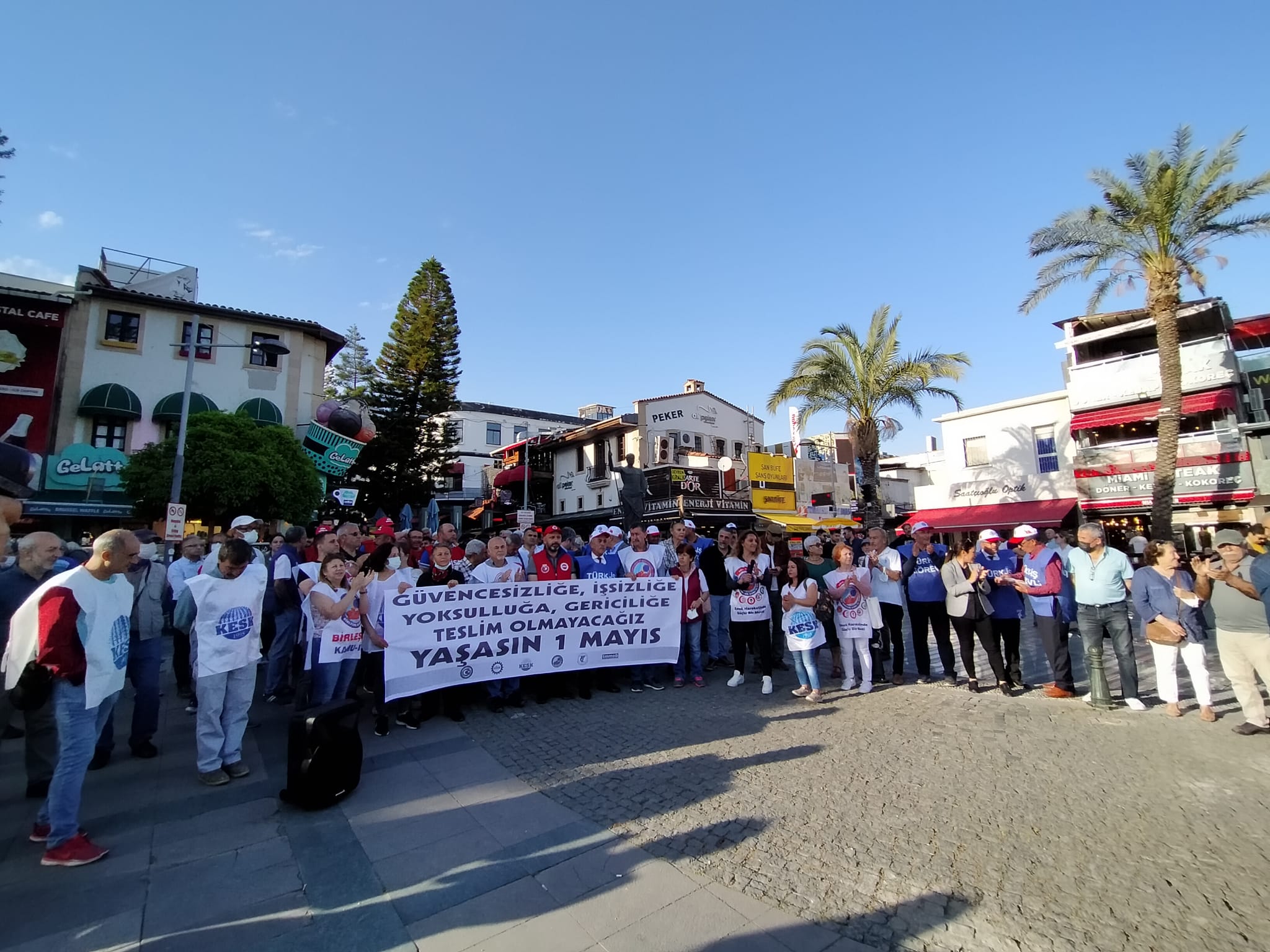 DİSK, KESK, Türk -İş,TMMOB ve TTB ve Bileşik Kamu-İş den oluşan 1 Mayıs tertip komitesi Attalos Heykeli önünde yaptığı basın açıklamasıyla Antalyalıları 1 Mayıs’a davet etti. Tertip komitesi adına konuşan Türk İş Antalya İl Temsilcisi Cemil Ünal “Bize açlığı, sefaleti, kölece çalışmayı, güvencesizliği reva gören, her koşulda emekçilerin, halkın değil sermayenin, patronların yüzünü güldüren, haklarımızı özgürlüklerimizi ortadan kaldıranlara inat, umudu büyütmek için halktan emekten yana eşit bir sistem kurmak için 1 Mayıs’ta alanlardayız.