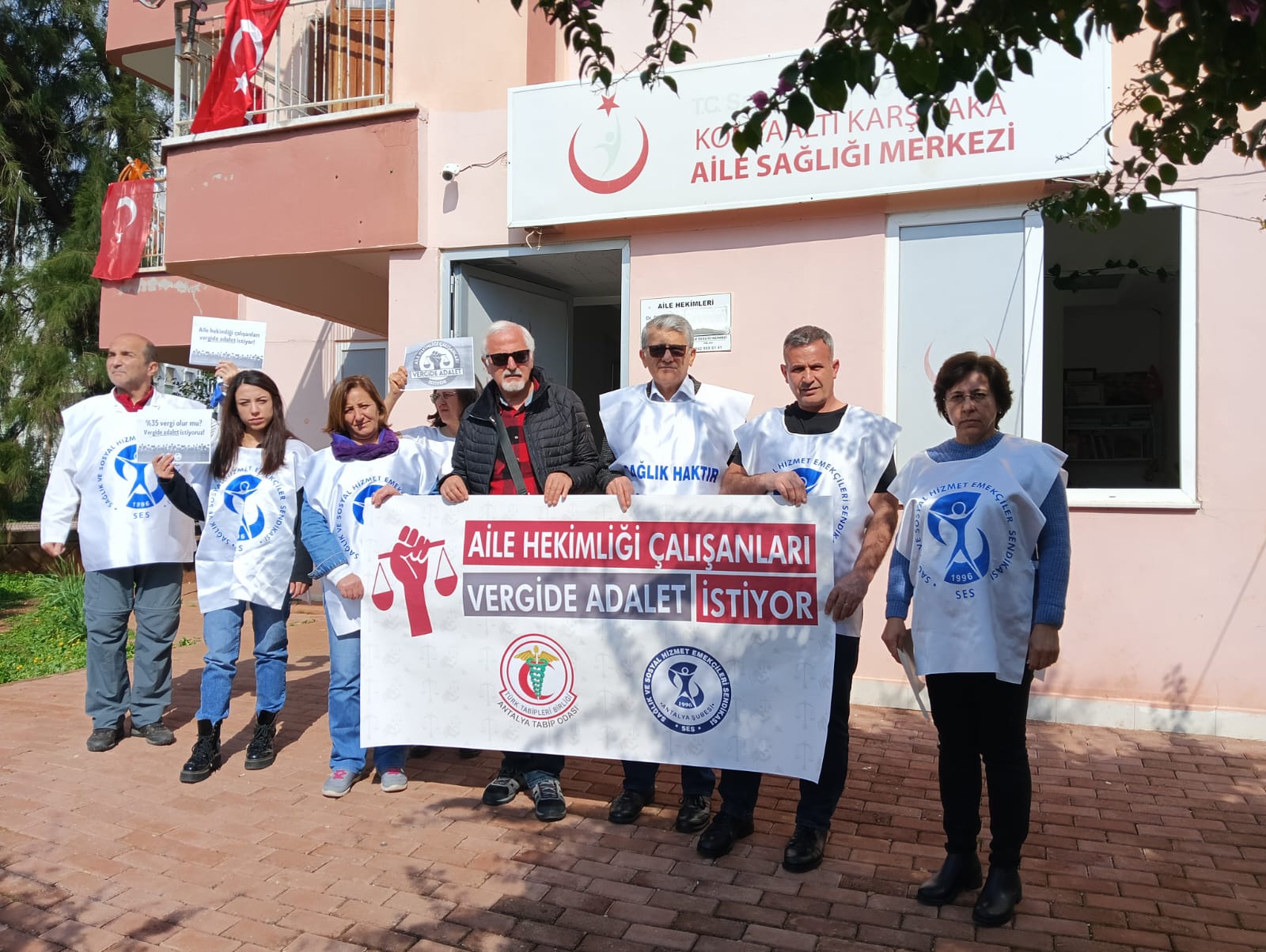 Sağlık ve Sosyal Hizmet Emekçileri Sendikası (SES) Antalya Şubesi ve Antalya Tabip Odası’nın çağrısıyla bir araya gelen Aile Sağlığı Merkezi Çalışanları “ Vergide Adalet İstiyoruz” talebiyle eylem sürecini başlattı. Konyaaltı ilçesinde bulunan Karşıyaka Aile Sağlığı Merkezi önünde toplanan Aile Sağlığı Merkezi Çalışanları adına konuşan SES Antalya Şube Eş Başkanı Şükran İçin “Amacımız vergide adalet ve sabit yüzde 15 vergi. Milyarlarca liralık ihale yapanlardan, kuyumculardan, fabrika sahibi olanlardan alınmayan vergiler bizden bordro üzerinden alınıyor.