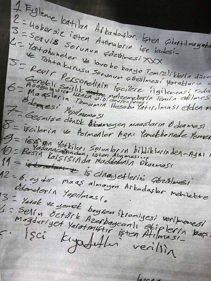 İşçiler haklarını aradıkları için işten çıkarılan arkadaşlarının işe iadesini istiyorlar. Bunun yanı sıra, duş ve tuvalet imkanlarının sağlandığı yatakhanelerde tahtakurusu olmayan yataklarda uyumak, doyurucu bir yemek talep ediyorlar.