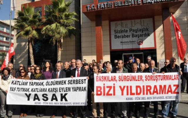 10 Ekim’de yaşanan katliamı protesto etmek için KESK, DİSK, TMMOB ve TTB tarafından alınan grev kararına katıldıkları gerekçesi ile Fatih Belediyesinde çalışan 6 belediye emekçisine soruşturma açılarak Fatih Kaymakamlığı’na sürgün edilmeleri üzerine Tüm Bel Sen bu gün Fatih Belediyesi önünde basın açıklaması gerçekleştirdi.