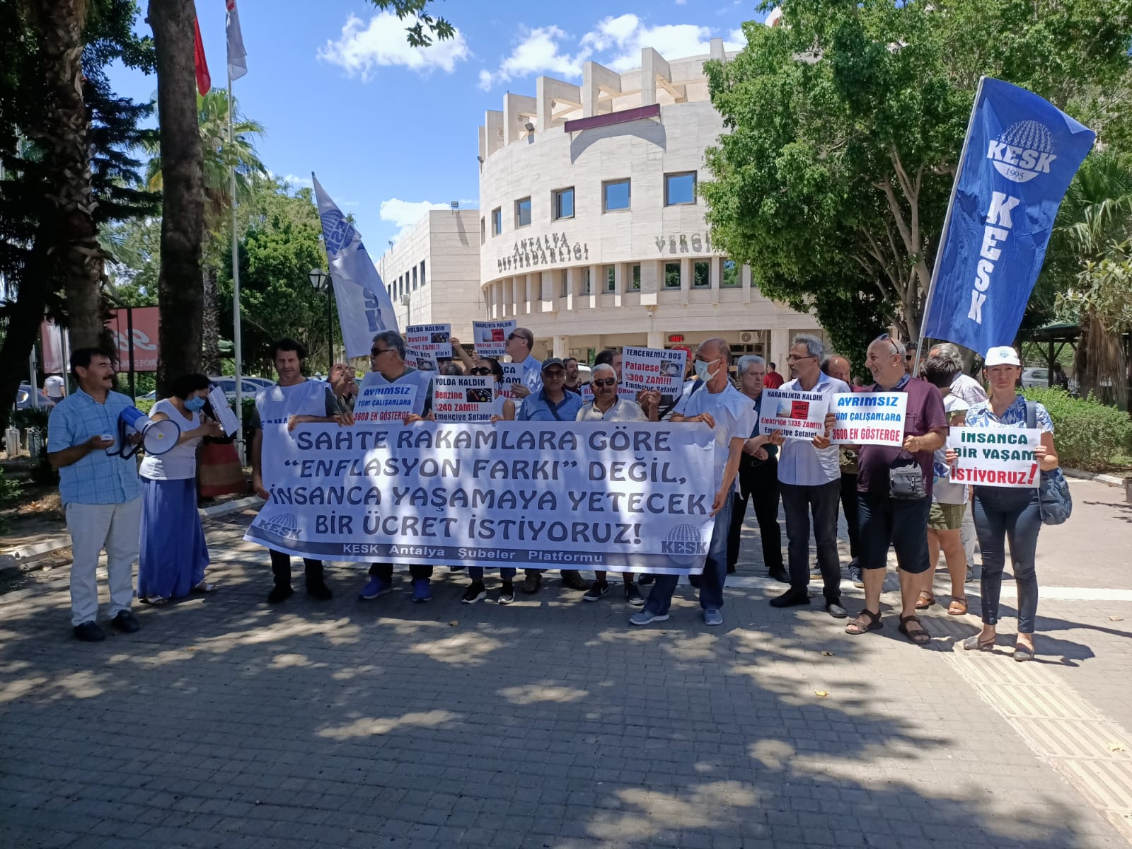 KESK Antalya Şubeler Platformu, insanca bir yaşam, insanca yaşamaya yetecek bir ücret talebiyle basın açıklaması yaptı. Antalya Defterdarlığı önünde toplanan KESK üyeleri adına konuşan KESK Antalya Şubeler Platformu Dönem Sözcüsü Devrim Mol şunları ifade etti.