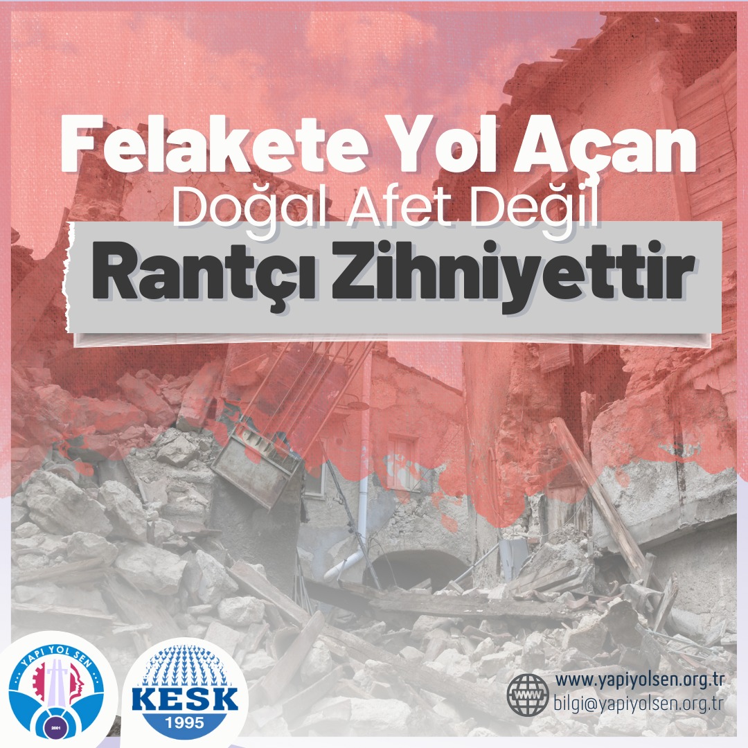 YAPI YOL-SEN Genel Merkezi 17 Ağustos Marmara depreminin 23. yılı nedeniyle yaptığı açıklamada, afet yönetiminin rant alanı olmaktan çıkarılması gerektiğini belirtildi.
