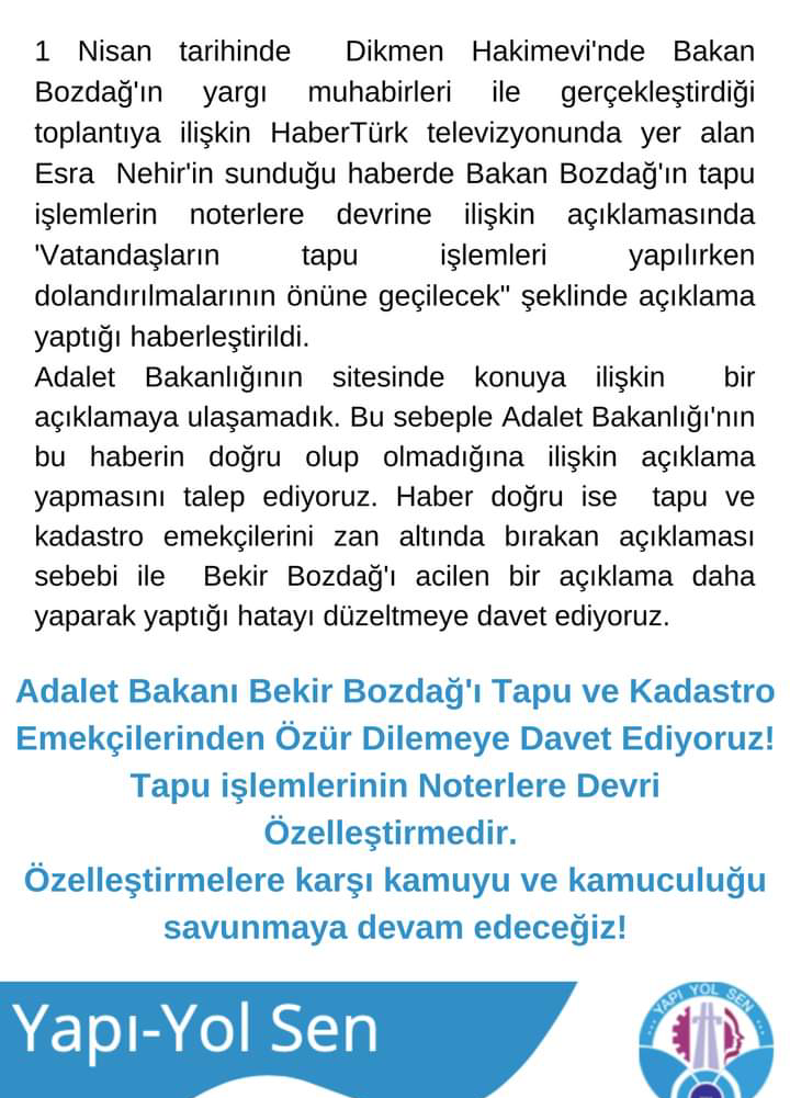 Yol, Yapı, Altyapı, Tapu ve Kadastro Emekçileri Sendikası(Yapı-Yol Sen) geçtiğimiz yargı mensupları ile basın toplantısı yapan Adalet Bakanı Bekir Bozdağ’ın Tapu Sicil işlemlerinin Noterlerde de gerçekleştirilmesi için gerekli düzenlemelerin yapıldığına ilişkin bilgi verirken sarf ettiği iddia edilen sözlerinin haber kanallarına yansımasıyla ilgili bir açıklama yayınladı.